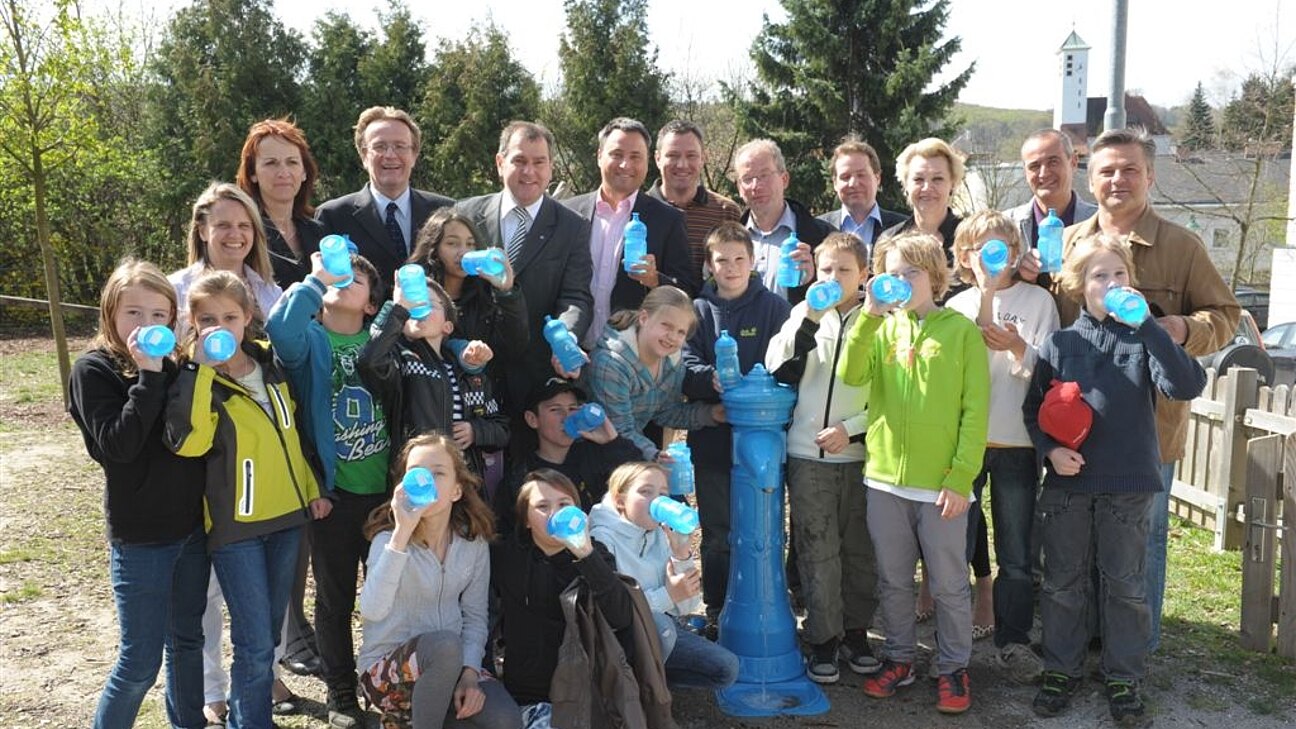 In Anwesenheit der neuen Volksschuldirektorin Karin Sampl und vielen Kindern der Volksschule hieß es nun offiziell "Wasser marsch" und auch die, von EVN Wasser mitgebrachten Trinkflaschen kamen zum Einsatz.