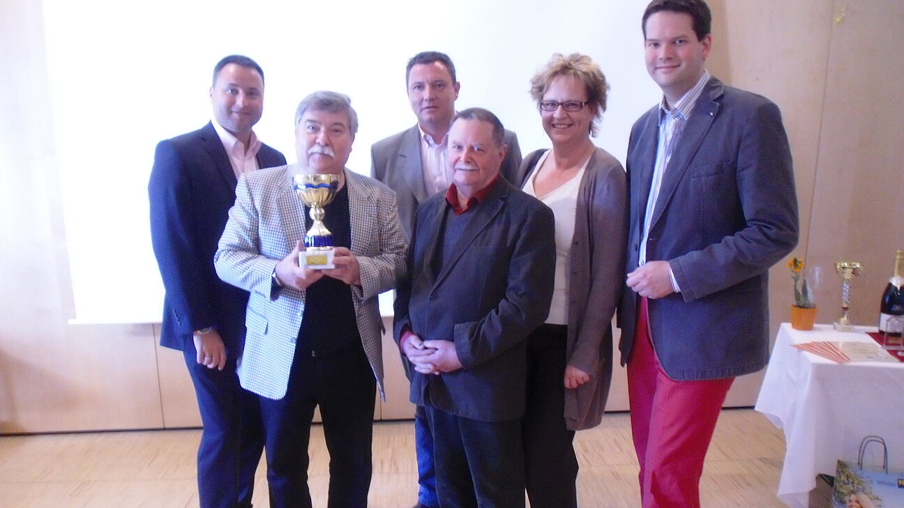 Bild: v.l.n.r.: Bgm. Michael Cech, Werner Sprenger mit Siegerpokal, GR. Robert Schreiner, Ehrenobmann Josef Sattler, GGR. Ingrid Maygraber, LAbg. Lukas Mandl